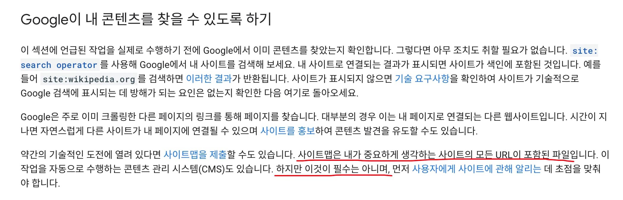 물론 내 사이트가 유명하지 않아서 크롤러가 접근할 진입점이 많지 않다던가 하는 이유로 페이지가 존재한다는 것을 선제적으로 알려주는 것이 좋은 옵션이라서 sitemap 작업을 할 뿐이죠.